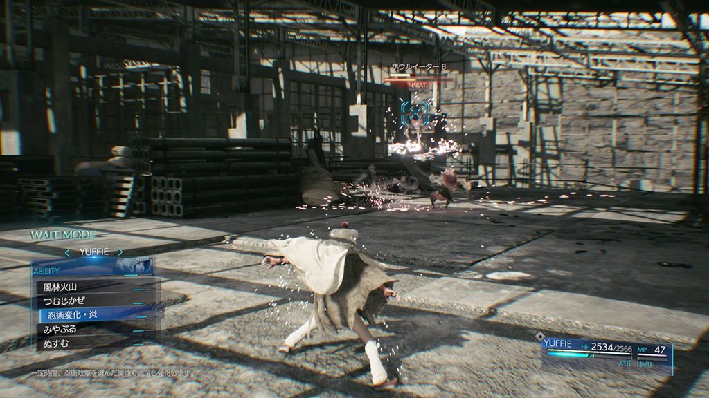 不僅是近身戰,尤菲也能夠因應遠距戰。以△按鈕施展「投擲手裏劍」,投出手裏劍進行攻擊的期間,□按鈕的攻擊會變成「忍術」。可透過固有能力來隨意變更忍術的屬性,因此能配合敵人的弱點,有效率地對其造成傷害。