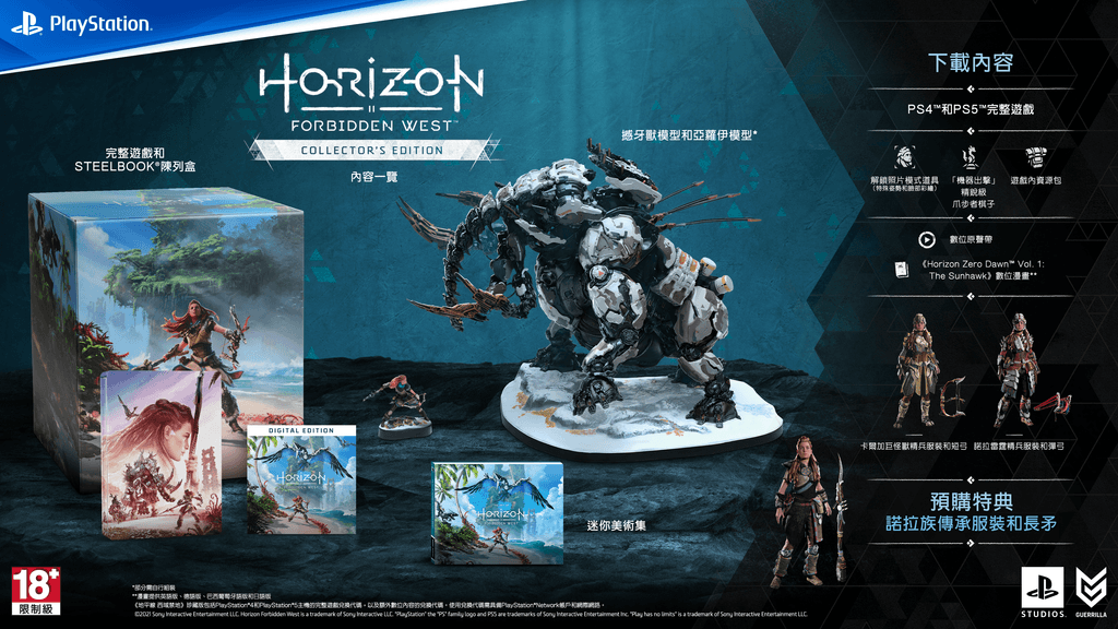 以下是預購《地平線 西域禁地》時的版本選項。附帶一提,無論在任何地方預購任何版本(特定區域*),都能獲得遊戲內道具「諾拉族傳承服裝和長矛」,可於PlayStation Store兌換。