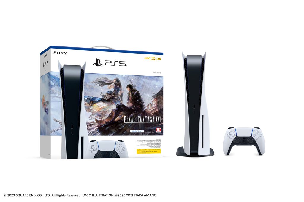 套裝包含PlayStation®5 (PS5™)主機(光碟版)、DualSense無線控制器、PS5遊戲《FINAL FANTASY XVI》兌換券(受條款與細則約束)及遊戲內道具,由2023年6月22日起發售。