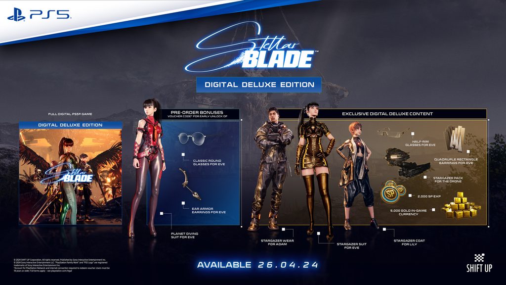 除了發售日期,在此也一併向你介紹體驗《劍星》的各種選項。數位版將由2月7日起於PlayStation Store開放預購,實體版則由3月1日起接受預購。顧客凡預購任何版本之《劍星》均可提前解鎖伊芙的星球空降衣及伊芙的經典圓框眼鏡,以及獲得伊芙的護耳耳飾。