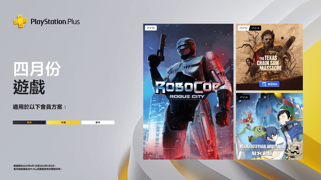 PlayStation Plus會員可在5月5日之前,將《RoboCop: Rogue City》、《The Texas Chain Saw Massacre》和《數碼寶貝物語:網路偵探 駭客追憶》新增至遊戲保存庫中。