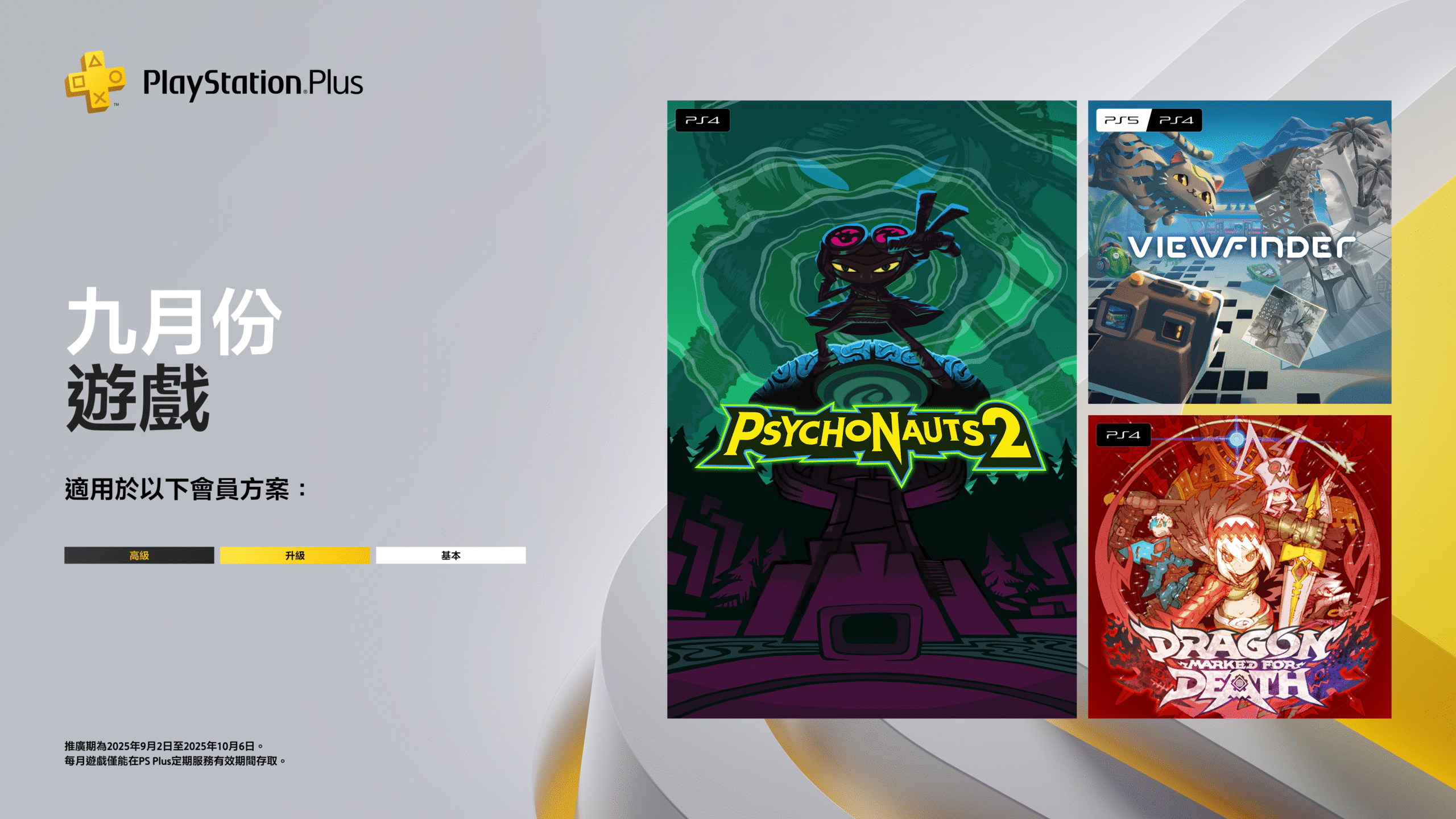 PlayStation Plus會員可在10月6日星期一或之前,將《Psychonauts 2》、《Dragon Marked For Death》和《Viewfinder》新增至遊戲保存庫。